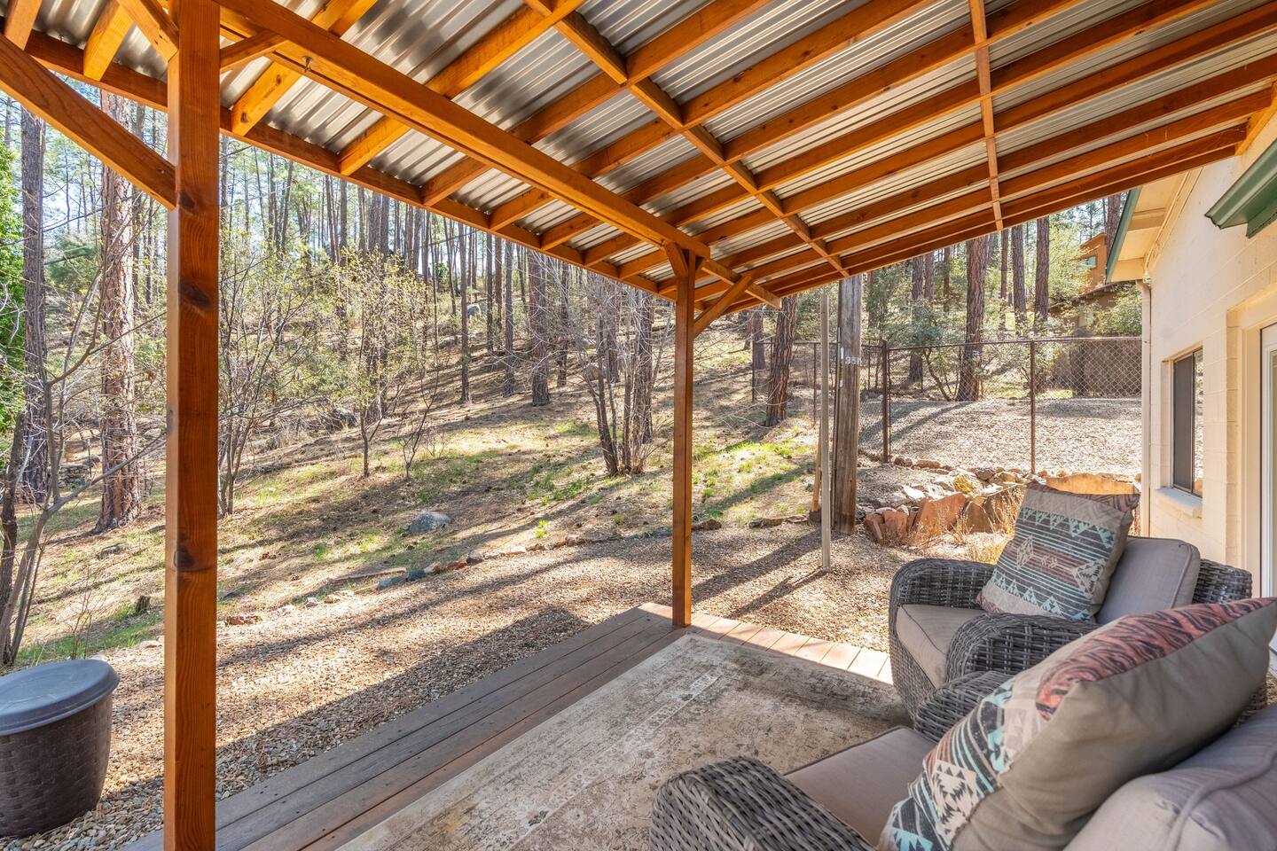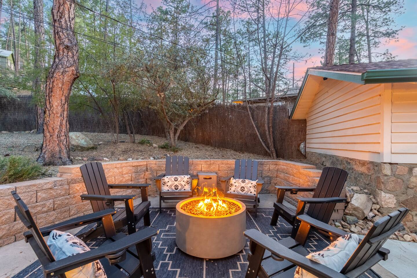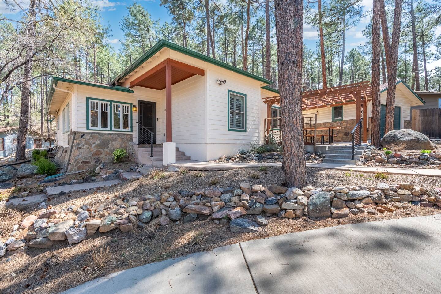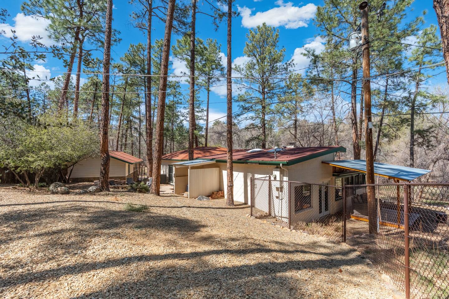 PROXIMITY: * Located in the iconic Mountain Club neighborhood * Enjoy nature walks * 0.6 mile from Safeway * 1.1 miles from LazyG Brewhouse * 1.5 miles from the Yavapai County Courthouse/Whiskey Row * 2.5 miles from the World’s Oldest Rodeo Grounds * 3.7 miles from Thumb Butte Hiking Trail #33 * 6.9 miles from Watson Lake * 10.6 miles from Antelope Hills Golf Course * 1 hour drive to Jerome * 1.25 hour drive to Cottonwood/wineries * 1.5 hour drive to Sedona .* 1.75 hour drive to Phoenix * 2.5 hour drive to Grand Canyon HOME: ✔ Central Air AC & heat ✔ In the mountains surrounded by towering pines (yes, there are neighboring cabins, we are not secluded) ✔ 3 bedrooms with king beds ✔ 2 full bathrooms (jetted clawfoot tub) ✔ Fully Fenced in yard (perfect for dogs) ✔ Full kitchen w/ dining room and breakfast bar ✔ Living room w/ wood burning fireplace (display only) ✔ Board games ✔ Outdoor firepit and 3 separate outdoor patios ✔ Onsite laundry room KITCHEN: ✔ Kitchen stocked w/ all essentials ✔ Keurig coffee machine & drip coffee station w/ pods ✔ Breakfast bar with a view LIVING ROOM: ✔ 65" Smart TV, BYOP (Bring your own passwords) ✔ Record Player ✔ 6 seater dining table BEDROOM 1: ✔ King size firm mattress ✔ Cotton linens ✔ Laptop-friendly workspace w/ free WiFi ✔ 43" Smart TV, BYOP (Bring your own passwords) ✔ Sound machine ✔ Side lamps and USB plugs ✔ Attached bathroom BEDROOM 2: ✔ King size firm mattress ✔ Cotton linens ✔ 40" Smart TV, BYOP (Bring your own passwords) ✔ Sound machine ✔ Side lamps and USB plugs BEDROOM 3: ✔ King size firm mattress ✔ Twin size trundle mattress ✔ Cotton linens ✔ 40" Smart TV, BYOP (Bring your own passwords) ✔ Sound machine ✔ Side lamps and USB plugs ✔ Only door to backyard from inside the house BATHROOM 1: ✔ Attached to bedroom 1 ✔ Shower on jetted claw foot tub ✔ Shampoo/Conditioner/Body Wash provided BATHROOM 2: ✔ Hallway bathroom ✔ Shower w/ glass door ✔ Shampoo/Conditioner/Body Wash provided BACKYARD: ✔ Fully Fenced ✔ Propane Firepit ✔ Cornhole NOTE: This property sleeps 7 guests in 4 beds. The twin trundle is located under the king bed in bedroom 3.