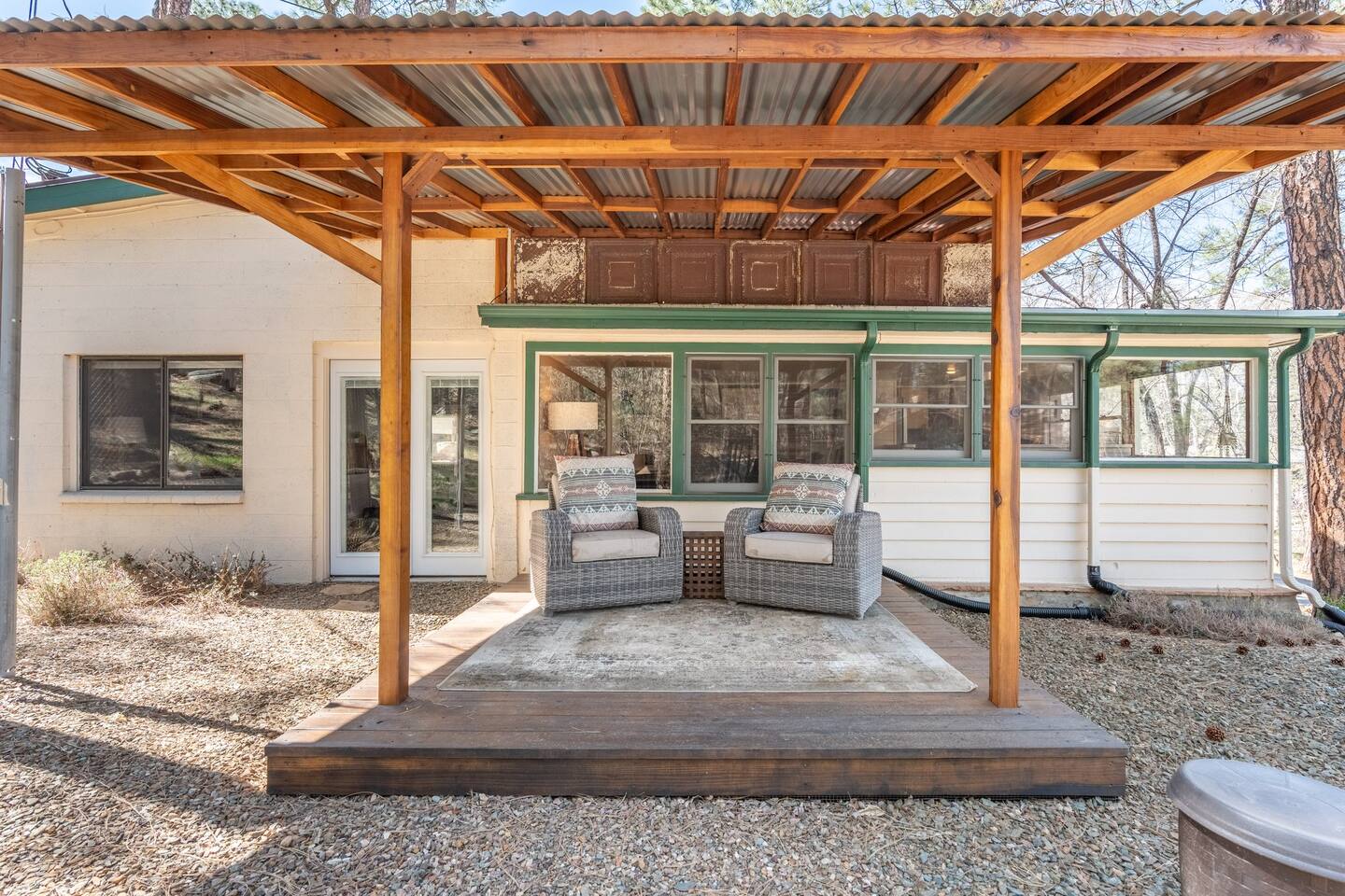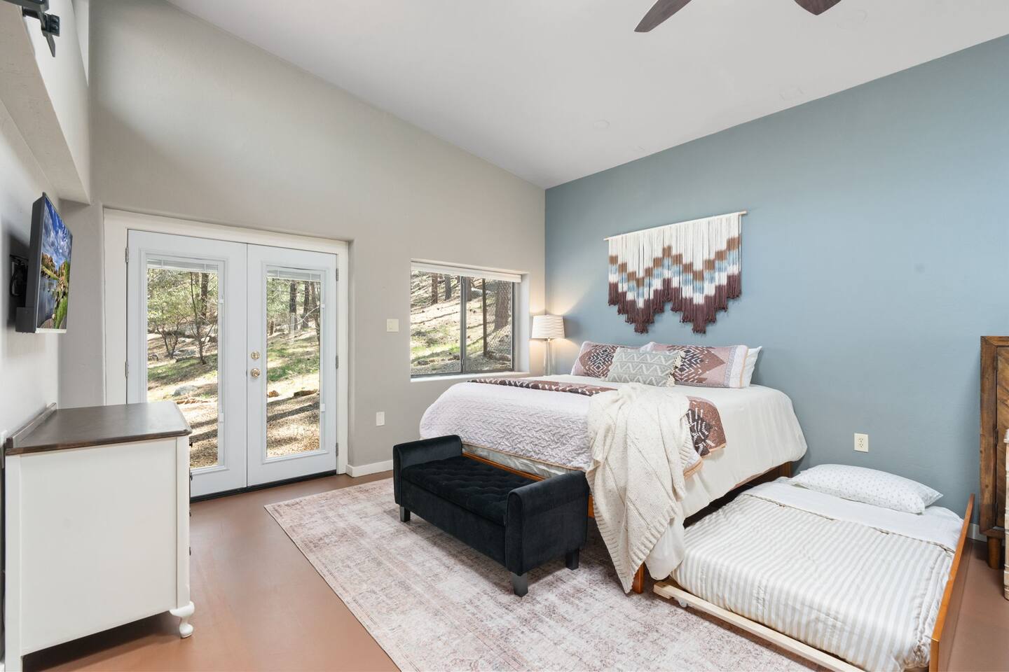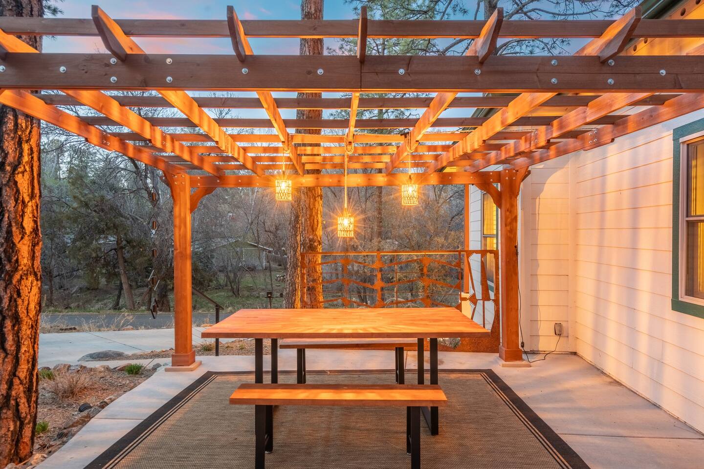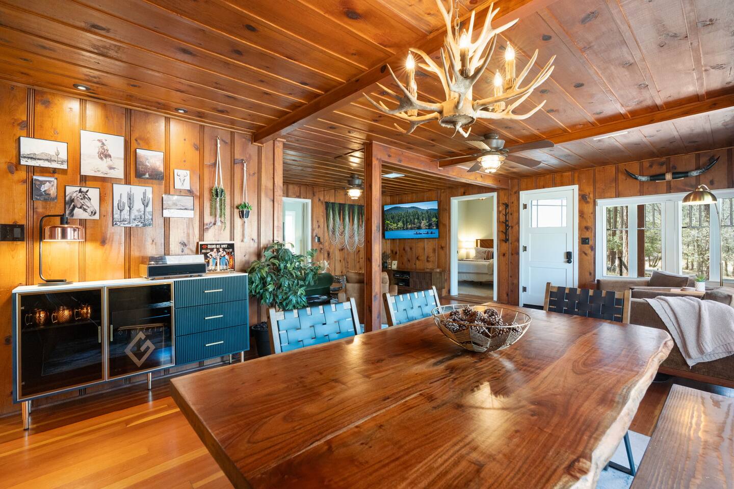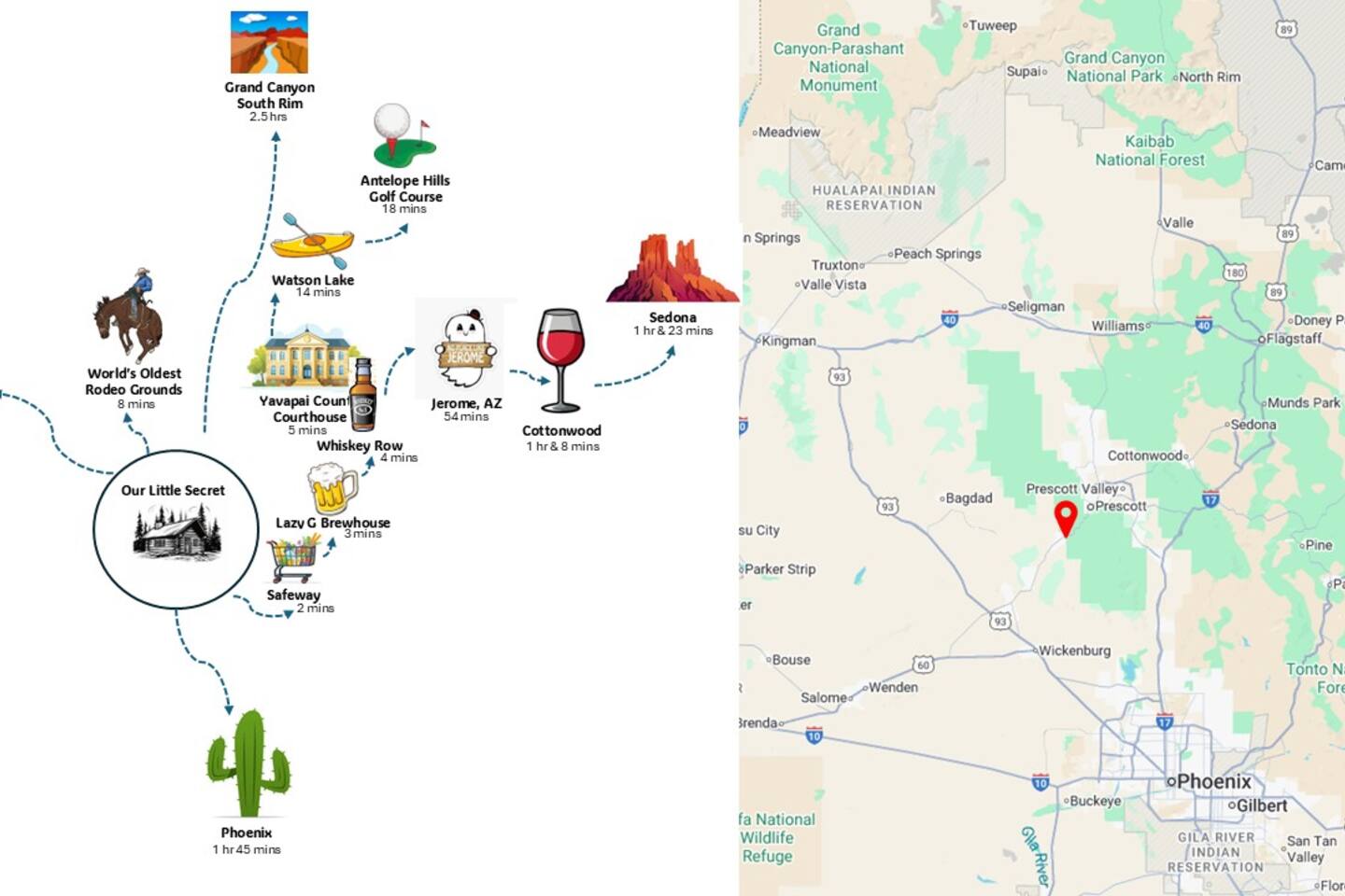 PROXIMITY: * Located in the iconic Mountain Club neighborhood * Enjoy nature walks * 0.6 mile from Safeway * 1.1 miles from LazyG Brewhouse * 1.5 miles from the Yavapai County Courthouse/Whiskey Row * 2.5 miles from the World’s Oldest Rodeo Grounds * 3.7 miles from Thumb Butte Hiking Trail #33 * 6.9 miles from Watson Lake * 10.6 miles from Antelope Hills Golf Course * 1 hour drive to Jerome * 1.25 hour drive to Cottonwood/wineries * 1.5 hour drive to Sedona .* 1.75 hour drive to Phoenix * 2.5 hour drive to Grand Canyon HOME: ✔ Central Air AC & heat ✔ In the mountains surrounded by towering pines (yes, there are neighboring cabins, we are not secluded) ✔ 3 bedrooms with king beds ✔ 2 full bathrooms (jetted clawfoot tub) ✔ Fully Fenced in yard (perfect for dogs) ✔ Full kitchen w/ dining room and breakfast bar ✔ Living room w/ wood burning fireplace (display only) ✔ Board games ✔ Outdoor firepit and 3 separate outdoor patios ✔ Onsite laundry room KITCHEN: ✔ Kitchen stocked w/ all essentials ✔ Keurig coffee machine & drip coffee station w/ pods ✔ Breakfast bar with a view LIVING ROOM: ✔ 65" Smart TV, BYOP (Bring your own passwords) ✔ Record Player ✔ 6 seater dining table BEDROOM 1: ✔ King size firm mattress ✔ Cotton linens ✔ Laptop-friendly workspace w/ free WiFi ✔ 43" Smart TV, BYOP (Bring your own passwords) ✔ Sound machine ✔ Side lamps and USB plugs ✔ Attached bathroom BEDROOM 2: ✔ King size firm mattress ✔ Cotton linens ✔ 40" Smart TV, BYOP (Bring your own passwords) ✔ Sound machine ✔ Side lamps and USB plugs BEDROOM 3: ✔ King size firm mattress ✔ Twin size trundle mattress ✔ Cotton linens ✔ 40" Smart TV, BYOP (Bring your own passwords) ✔ Sound machine ✔ Side lamps and USB plugs ✔ Only door to backyard from inside the house BATHROOM 1: ✔ Attached to bedroom 1 ✔ Shower on jetted claw foot tub ✔ Shampoo/Conditioner/Body Wash provided BATHROOM 2: ✔ Hallway bathroom ✔ Shower w/ glass door ✔ Shampoo/Conditioner/Body Wash provided BACKYARD: ✔ Fully Fenced ✔ Propane Firepit ✔ Cornhole NOTE: This property sleeps 7 guests in 4 beds. The twin trundle is located under the king bed in bedroom 3.